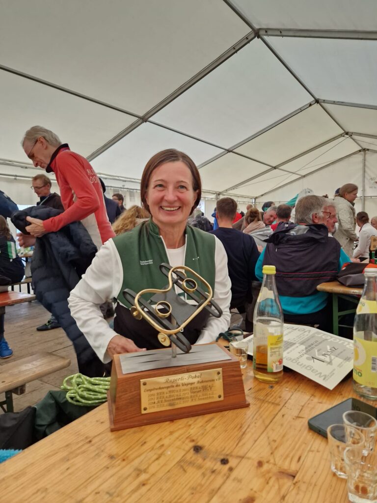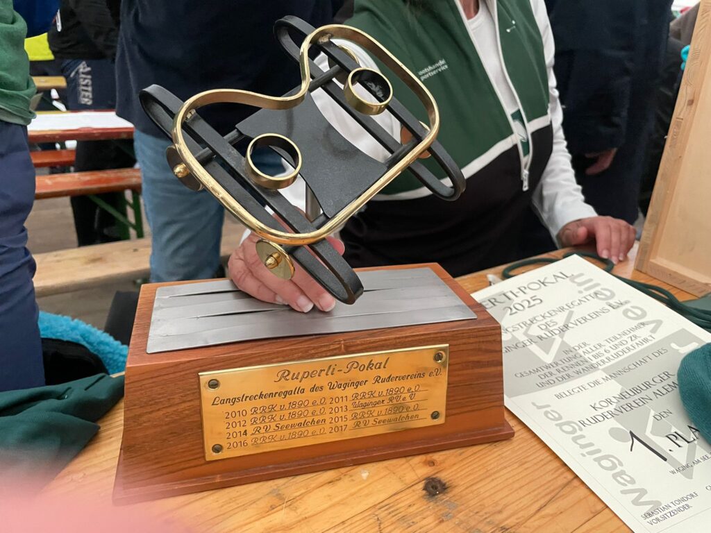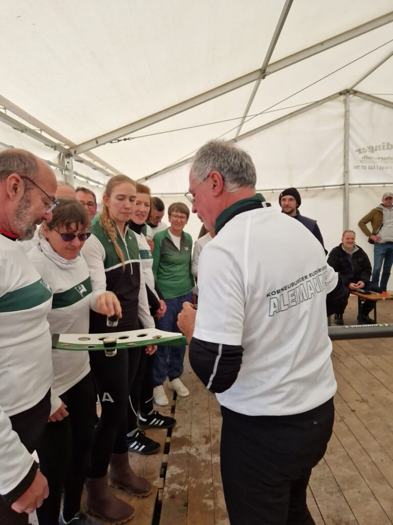 Zum Abschluss folgte die Gesamtwertung aller Bewerbe – und hier war die Freude riesig: Mit 222,5 Punkten und deutlichem Vorsprung sicherten sich die Alemannen den 1. Platz. Als Trophäe wurde uns der Ruperti Pokal überreicht – ein liebevoll gestalteter goldener Rollsitz als Wanderpokal. Ein echtes Highlight! Der goldene Rollsitz wurde natürlich gebührend gefeiert, inklusive einer Runde aus unserem Schnapsruder, das endlich wieder seinen großen Auftritt hatte.
