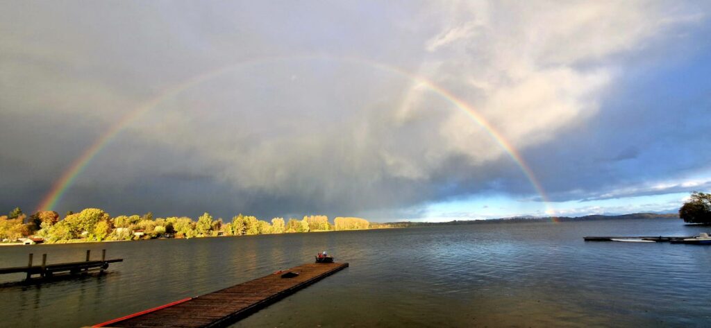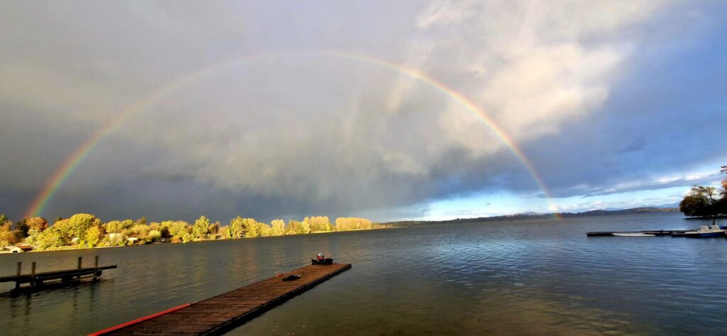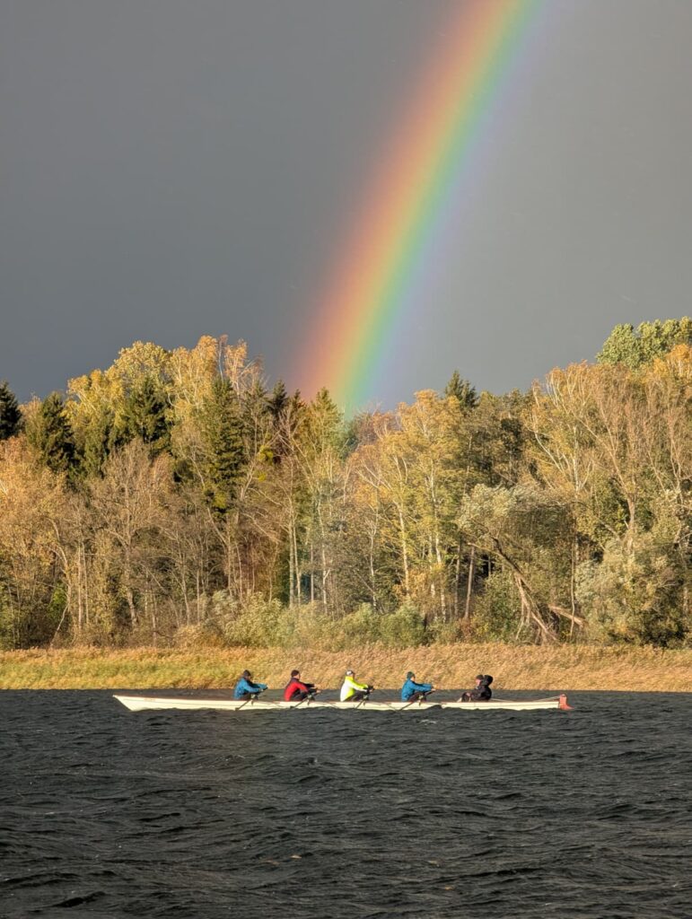 Gerade noch rechtzeitig traf auch unser letzter Steuermann ein – wetterfest per Rad unterwegs – und nutzte die Gelegenheit, sich gleich einen Eindruck von der Brückendurchfahrt zu verschaffen. Kaum auf dem Wasser, blinkte bereits die Sturm-Vorwarnung auf. Unsere Boote blieben dennoch draußen und wurden belohnt: Gerudert wurde unter einem beeindruckenden Regenbogen, zeitweise sogar bei Sonnenschein, als die Regenwolken weiterzogen. Besser hätte die Einstimmung kaum sein können, und so ließen wir den Abend gut vorbereitet und entspannt ausklingen – auch wenn sich manche kaum bremsen konnten, schon für den Renntag Energie zu tanken.